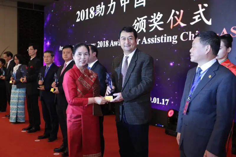 老挝驻华大使万迪·布达萨冯为“2018助力中国—东盟企业合作奖”颁奖。